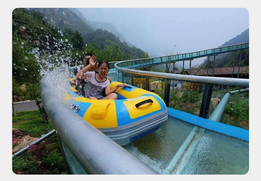 一是,依據大型生態漂流的體驗感,設計優化升級而來。依地勢修建漂流槽,槽內水深約20公分,水在漂流槽中托船順流而下,速度可控,刺激與安全兼得,確保百分之三百的安全。在設計上我們可以做到游客在漂流過程中基本不濕衣物。我們暫且稱這種形式的漂流為水滑道漂流。